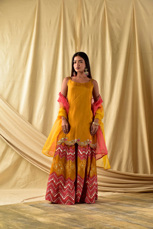 Burnt Yellow Kurta with Printed Sharara Set